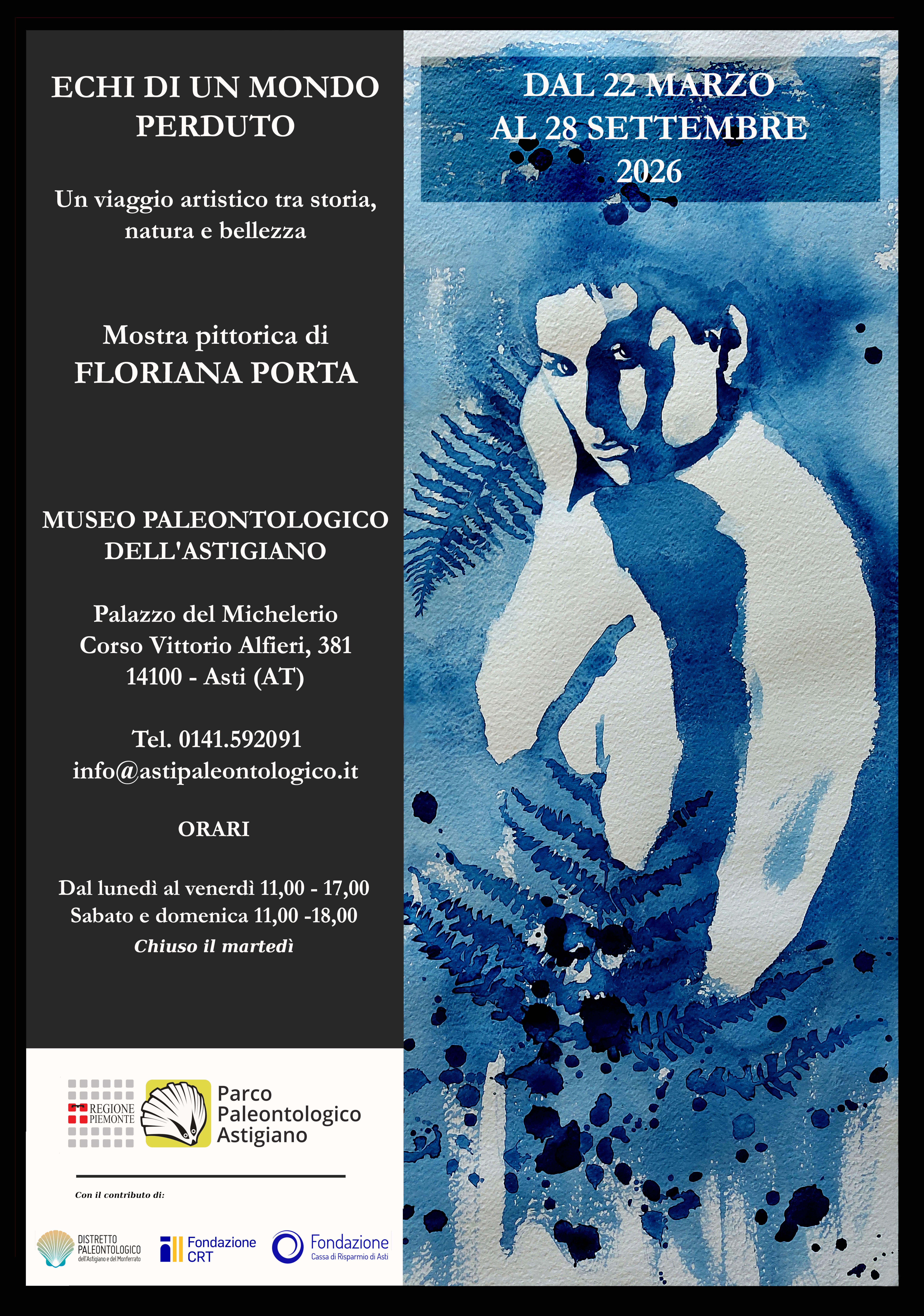Il 21 marzo 2026 si apre al Museo Paleontologico dell’Astigiano, a Palazzo del Michelerio, l’esposizione pittorica di Floriana Porta dal titolo “Echi di un mondo perduto”, un’occasione unica per scoprire, in un modo inedito e creativo, lo straordinario patrimonio di reperti fossili rinvenuti nell’Astigiano. La mostra unisce scienza e arte, fossili e acquerelli, tracce e versi, per offrire un nuovo sguardo sul mondo preistorico. Balene, conchiglie, rinoceronti e mastodonti: enigmi d’acqua e di terra sospesi tra storia e memoria.