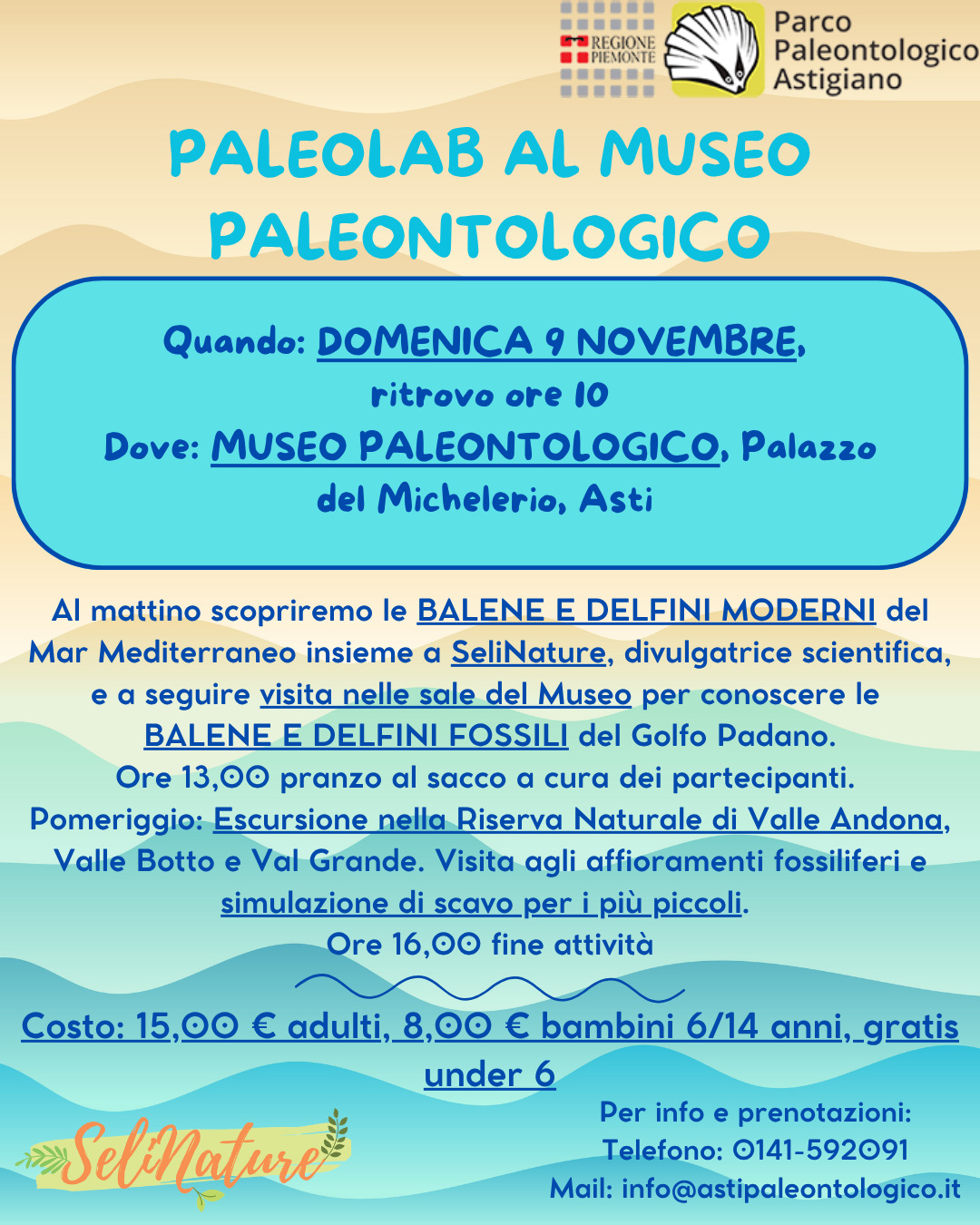 Costo: 15 € adulti, 8 € bambini 6/14 anni info@astipaleontologico.it