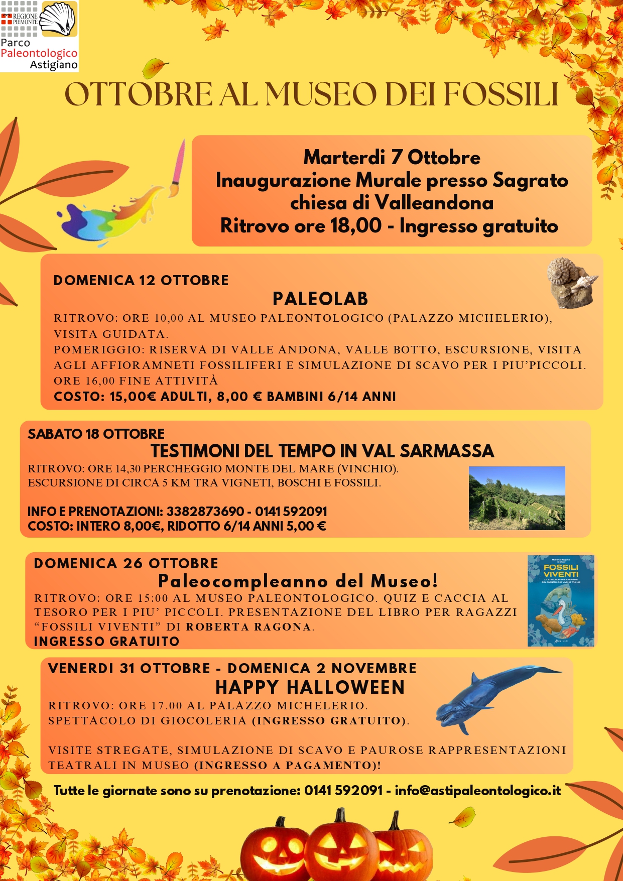 Ritrovo ore 10.00 al Museo Paleontologico di Asti. Mattinata con visita guidata al Museo, poi nel pomeriggio escursione nella Riserva di Valle Andona, Valle Botto, con visita agli affioramenti fossiliferi e simulazione di scavo per i più piccoli.