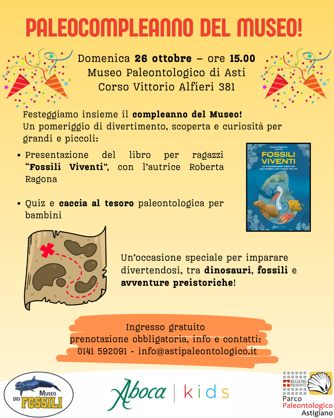 Ritrovo: ore 15,00 presso il Museo Paleontologico di Asti. Presentazione del libro per ragazzi “Fossili Viventi” di Roberta Ragona. Quiz e caccia al tesoro in museo a cura della scrittrice. Ingresso gratuito.