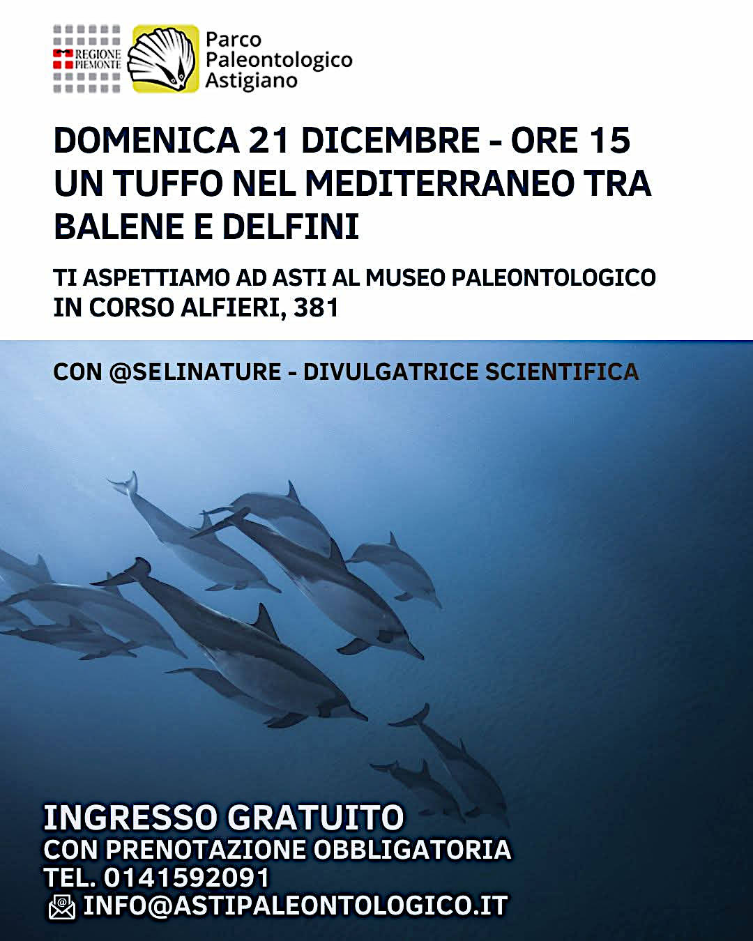Ritrovo: ore 15,00 al Museo Paleontologico di Asti. Scopriremo le balene e delfini moderni del Mar Mediterraneo, insieme a SeliNature, divulgatrice scientifica e a seguire visita nelle sale del museo per conoscere le balene e delfini fossili del Golfo Padano. Ore 17,00 fine attività. Ingresso gratuito.